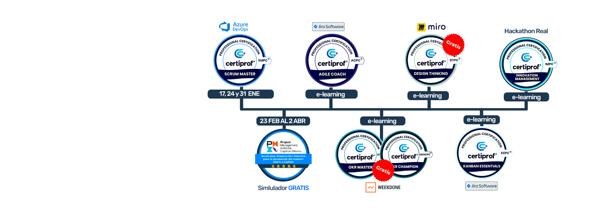 Diplomado Product y Agile Manager, adquiere tu Diplomado a bajo costo con curso y certificaciones gratuitas de Design Thinking Professional Certificate (DTPC®), Certificación en OKR Master Certified Professional -OKRMCP™ & OKR Champion Certified Professional – OKRCCP™ y Simulador del Examen PMP® gratis.